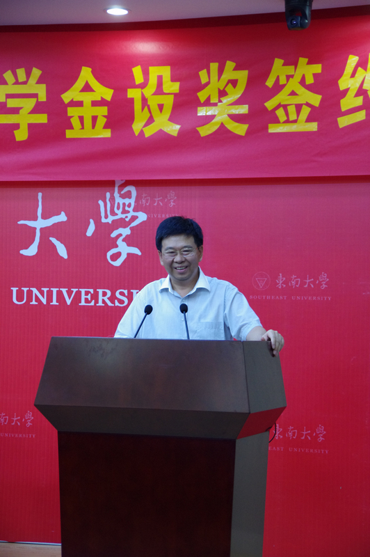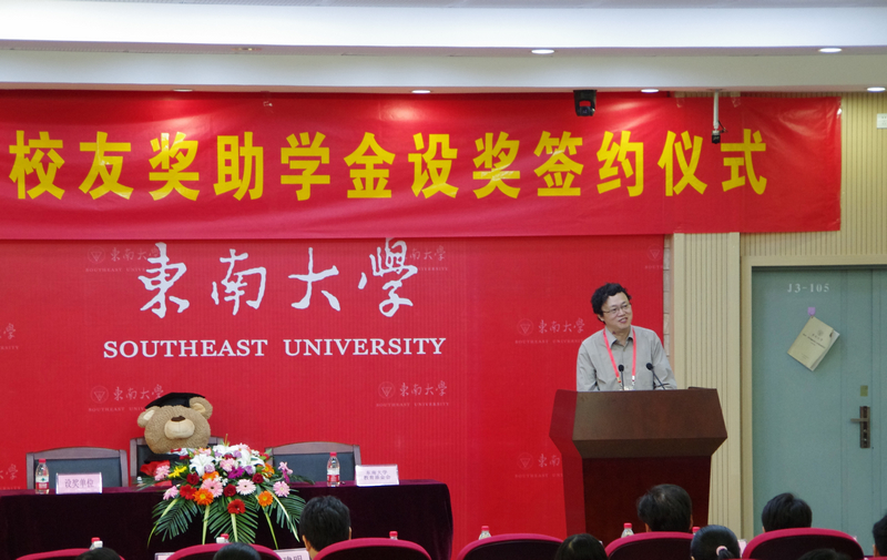 在此之后,校方代表谢建明老师依次和各设奖单位代表完成了奖助学金基金设立协议的签订。最后,谢建明老师在感言中着重强调员工之于学校之于员工的重要性,表达他对员工的尊重和欢迎。他不断引经据典,阐述作为老员工该有的精神气度和风貌。“为天地立心、为生民立命、为往圣继绝学、为万世开太平”,谢建明老师引用此句结束了他的演讲,让在座学子包括员工们心潮澎湃。