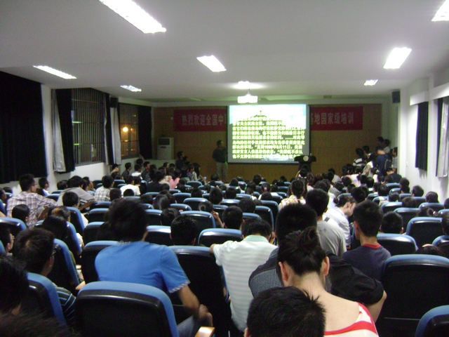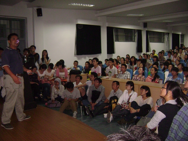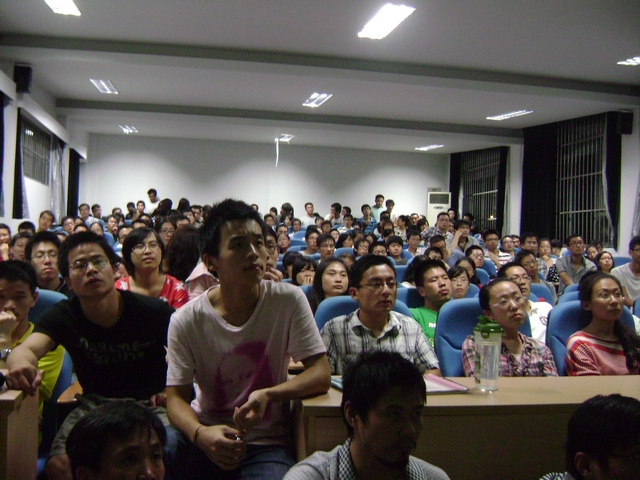 由于正好处于中日“钓鱼岛”博弈的关键时期,加之李有祥教授在学校的知名度和强大个人魅力,来参加讲座的同学特别多。教室里涌入了近400人,过道里、讲台下、门口都聚集了大量的同学,现场气氛相当热烈。