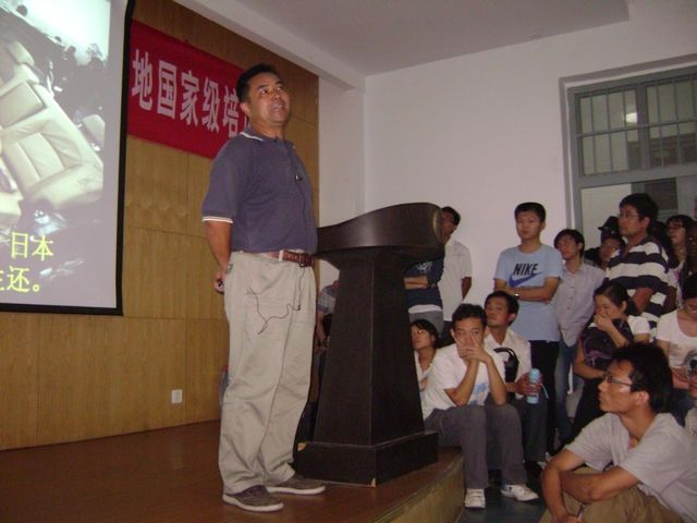 晚上七点整,在全场齐唱校歌之后,讲座正式开始。李有祥教授以《孙子兵法》中有关“战”的策略开题,提出了“爱国要有理性”、“保钓要讲智慧和谋略”等重要观点。对于时下全国各地都兴起的“反日”大游行,李教授给予了高度评价,认为政府应该在法律允许、保证社会稳定的前提下鼓励这种民众性质的游行示威活动。对于在游行中出现的少数“打、砸、抢”现象,李教授则给予了严厉的批评,认为这是“让亲者痛而仇者快”的愚蠢行为,应该坚决打击。