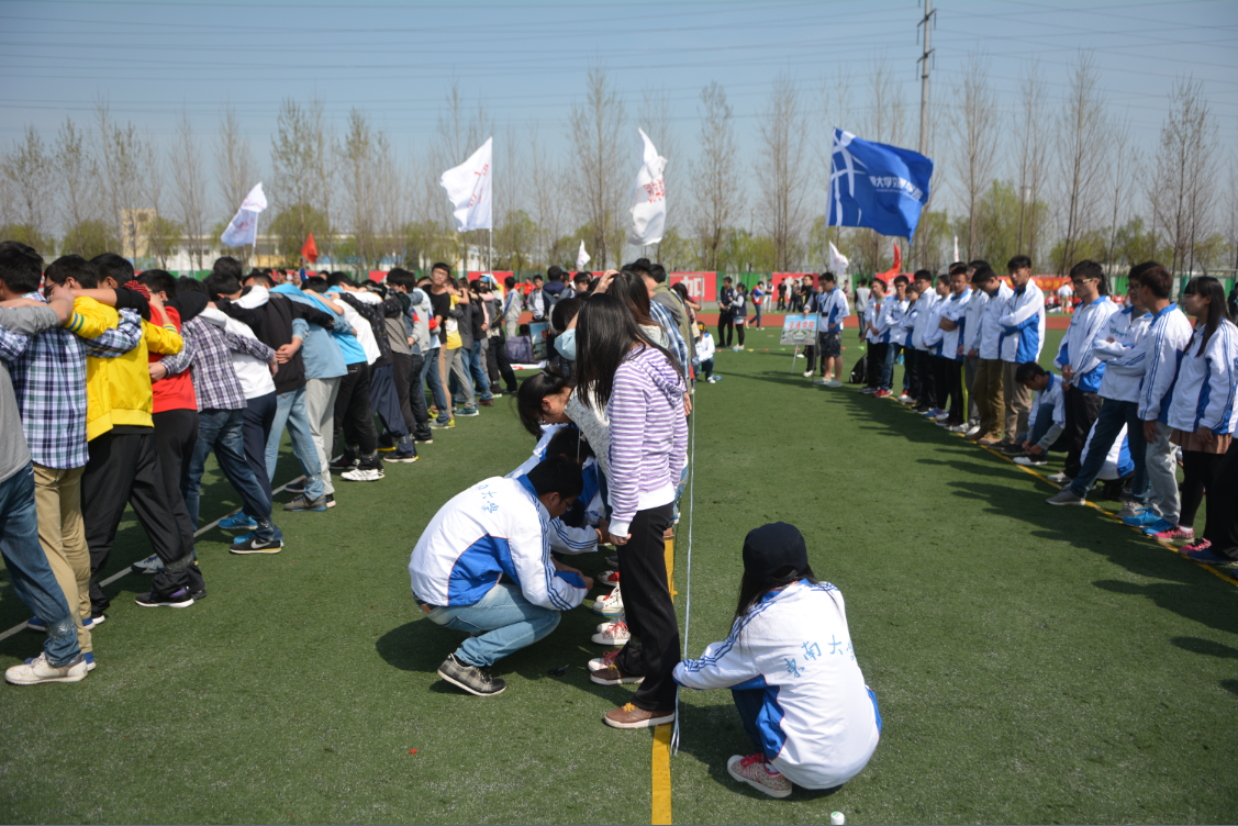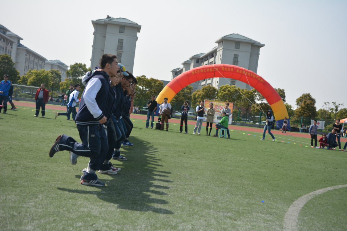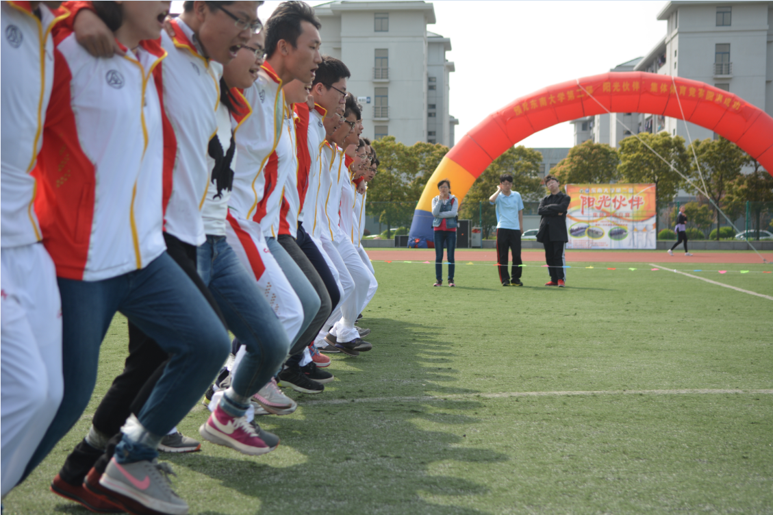 “阳光伙伴”是一种全新的集体运动,以增强比赛队员的团队精神和集体荣誉感, 励志进取为主要内容。本次比赛规定每支队伍组织25名同学绑腿跑,其中女生不得少于5人。比赛分预赛和决赛。预赛共分两轮,第一轮各院系按赛前抽签顺序两队一组进行比赛,按成绩取前16名进入第二轮;第二轮再取成绩前8名进入决赛。决赛实行单败淘汰制。