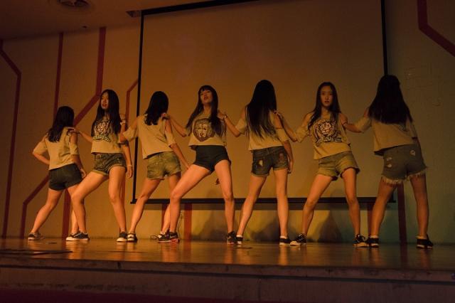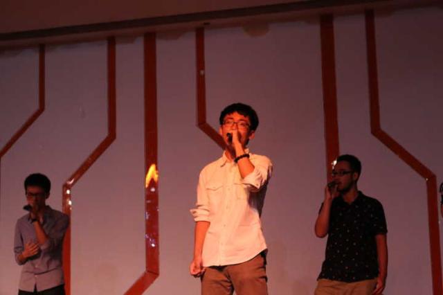 开场视频中,帅气的教官和辅导员一出场,全场同学就忍不住高呼,晚会还没开始现场就已经沸腾。视频刚结束,一支由吉他社、艺音社和合唱团共同组成的乐队便闪亮登场,奏唱了一曲《Wake me up when September ends》,火热的重金属音乐让整个场面迅速升温。随后大一新生许晴、张可欣带来的爵士舞热辣性感,再一次点燃了整个圆报。紧接着,合唱团大胆演绎阿卡贝拉纯人声合唱《Somebody that I used to know》,别有一番风情。正当大家仍沉浸在悠扬的歌声中时,大一新生彭铖、吴阅则带来了令人捧腹的相声,两人活泼搞笑,赢得了全场的掌声。