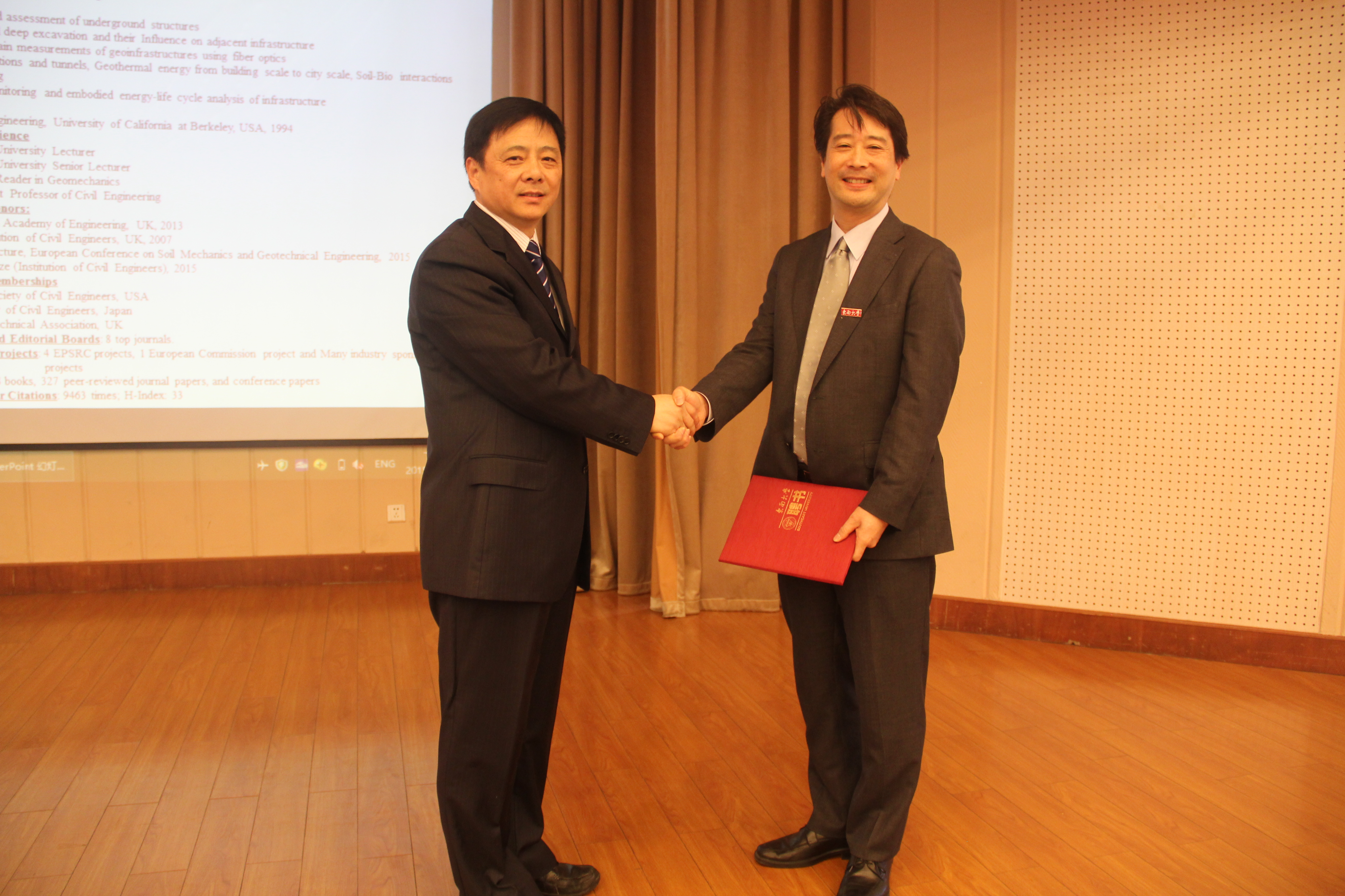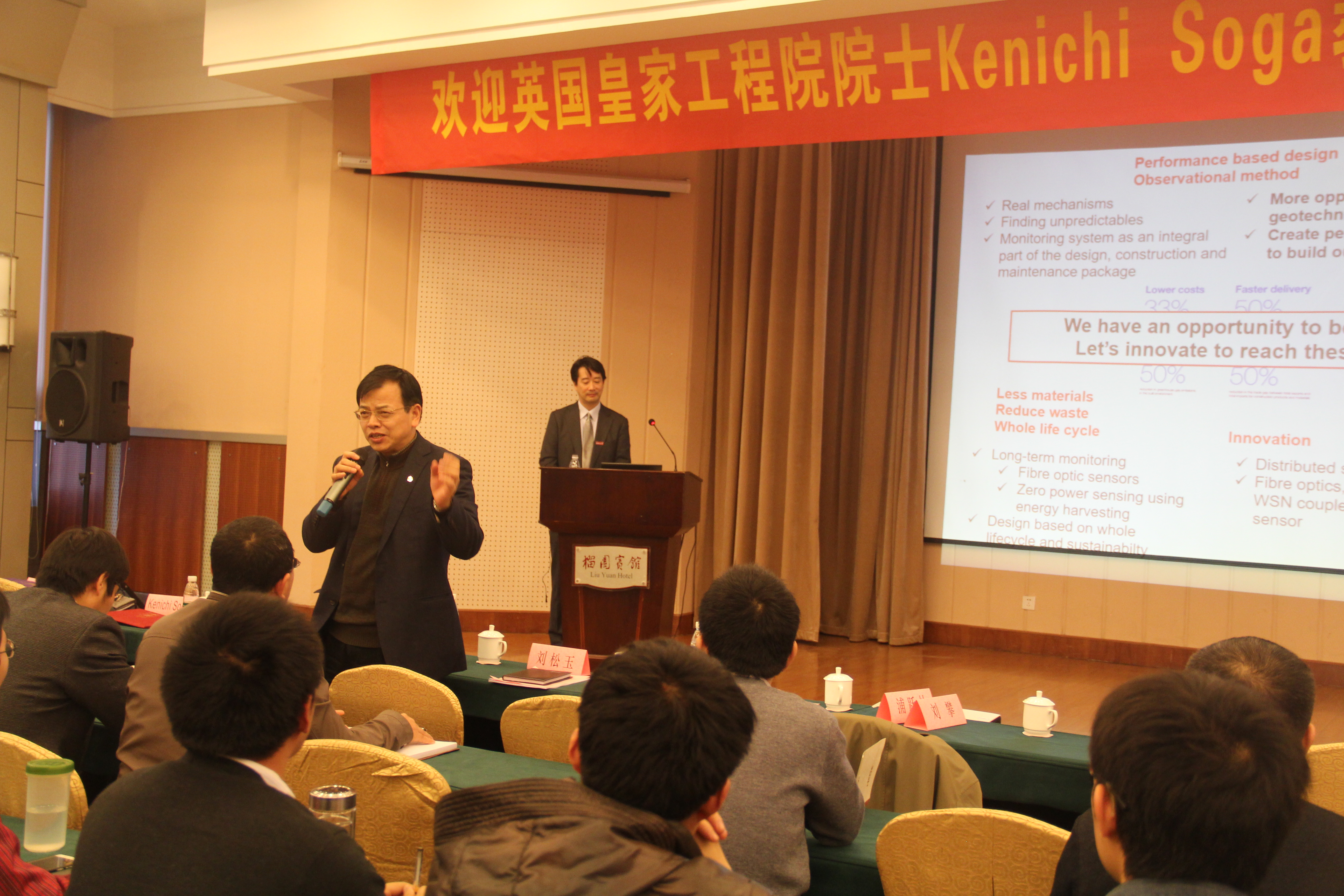 受聘仪式结束后,Kenichi Soga教授作了题为《分布式传感器在土木工程地下基础设施工作性能评估中的应用》的学术报告,着重介绍分布式传感器在土木工程地下基础设施工作性能评估中的应用实例,并讨论由数据分析及数值模拟所获得的工程启示。学术报告会由刘松玉教授主持,出席的教师和员工与Kenichi Soga教授进行了热烈的讨论,现场学术气氛浓厚,广大师生受益匪浅。