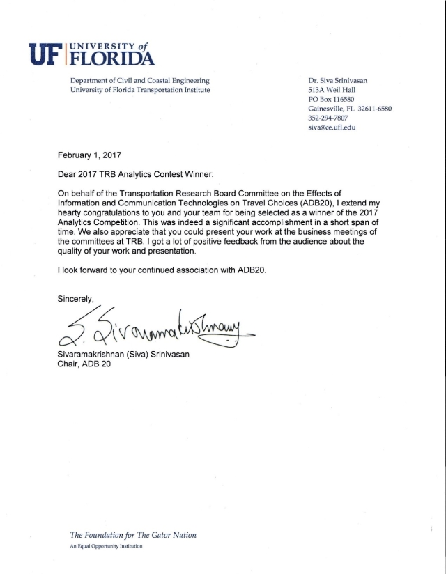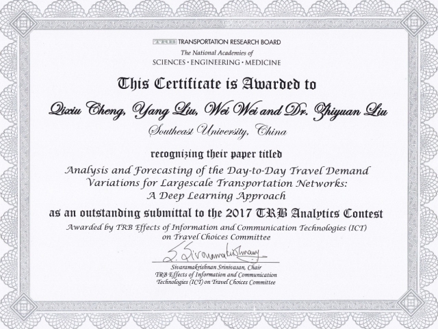 公司刘志远教授课题组完成的“Analysis and Forecasting of the Day-to-day Travel Demand Variations for Large-scale Transportation Networks: A Deep Learning Approach”研究报告获评美国交通研究委员会(TRB)颁发的交通数据分析大赛优秀论文奖。本次大赛由TRB“信息科技影响下的交通出行”分委会(ADB20)、“出行者行为与价值”分委会(ADB10)、“交通需求预测”分委会(ADB40)和“交通数据统计”分委会(ABJ80)联合举办,比赛数据主要由美国交通出行公司AirSage提供。参赛团队根据AirSage公司提供的佛罗里达州奥兰多地区一个月的手机信令数据,对该地区交通出行需求进行建模、分析、预测以及可视化展示等。本次比赛吸引了来自世界各地的37支队伍参赛,TRB组委会邀请同行专家对提交的报告进行评审,最终评选出5篇优秀论文,并邀请获奖者前往美国华盛顿参加2017年1月举办的第96届TRB年会。刘志远教授课题组提交的研究报告,是除北美地区以外的唯一一篇获奖报告。