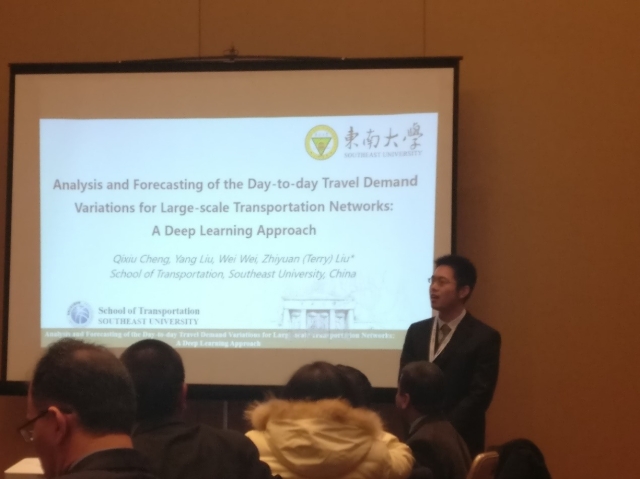 刘志远教授指导的博士生程启秀、刘洋和本科生魏薇,共同参与了本次比赛。通过对30天的手机信令数据进行分析,可视化展示了当地的交通出行需求;运用深度学习方法与技术,对比分析了深度神经网络、循环神经网络、特征级融合方法在逐日动态交通需求预测方面的预测精度,提出了适用于逐日动态交通需求预测的模型与方法。刘志远教授还应邀参加了2017年1月在华盛顿举办的第96届TRB年会并做报告,报告内容吸引了海内外众多学者的广泛关注。
