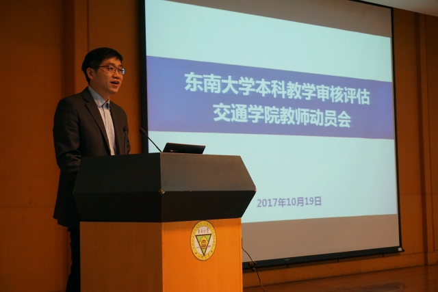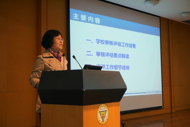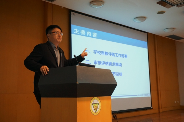 会上,学院教学副经理陈峻老师从“学校审核评估工作部署、审核评估要点解读、迎评工作细节说明”三个方面向全体教职工传达本科教学审核评估准备工作。