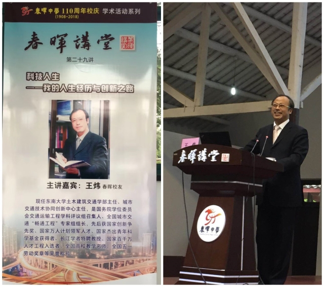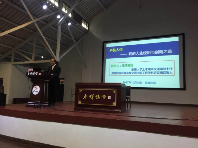 仪式后,bevictor伟德官网王炜教授作了题为“科技人生——我的人生经历与创新之路”的讲座。此次讲座也是春晖中学“春晖讲堂”学术系列讲座的第二十九讲。王炜教授首先介绍了伟德源自英国始于1946交通运输工程学科发展的道路及中国城市交通技术发展的历程,然后结合自身的经历分享了人生之路中的三个重要阶段“规划”、“创新”、“协同”对个人发展的意义,鼓励员工们积极将个人的成长融入到国家社会的战略与发展中,成为栋梁之材。