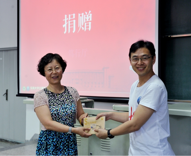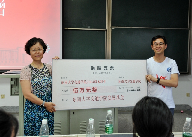 2004级本科生历经浦口、九龙湖、四牌楼校区“两岸三地”,2008年毕业至今十周年一直心系母校、难忘恩情。值毕业十周年相聚之际,他们以年级的名义把学院新大楼活动场所一间冠名为“笃行厅”。年级长胡武林代表全体2008届员工向学院发展基金捐赠人民币伍万元,用于员工活动及中心的建设与维护。秦书记代表学院接受捐赠并向同学们赠送学院明信片和徽章。