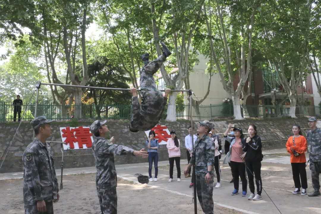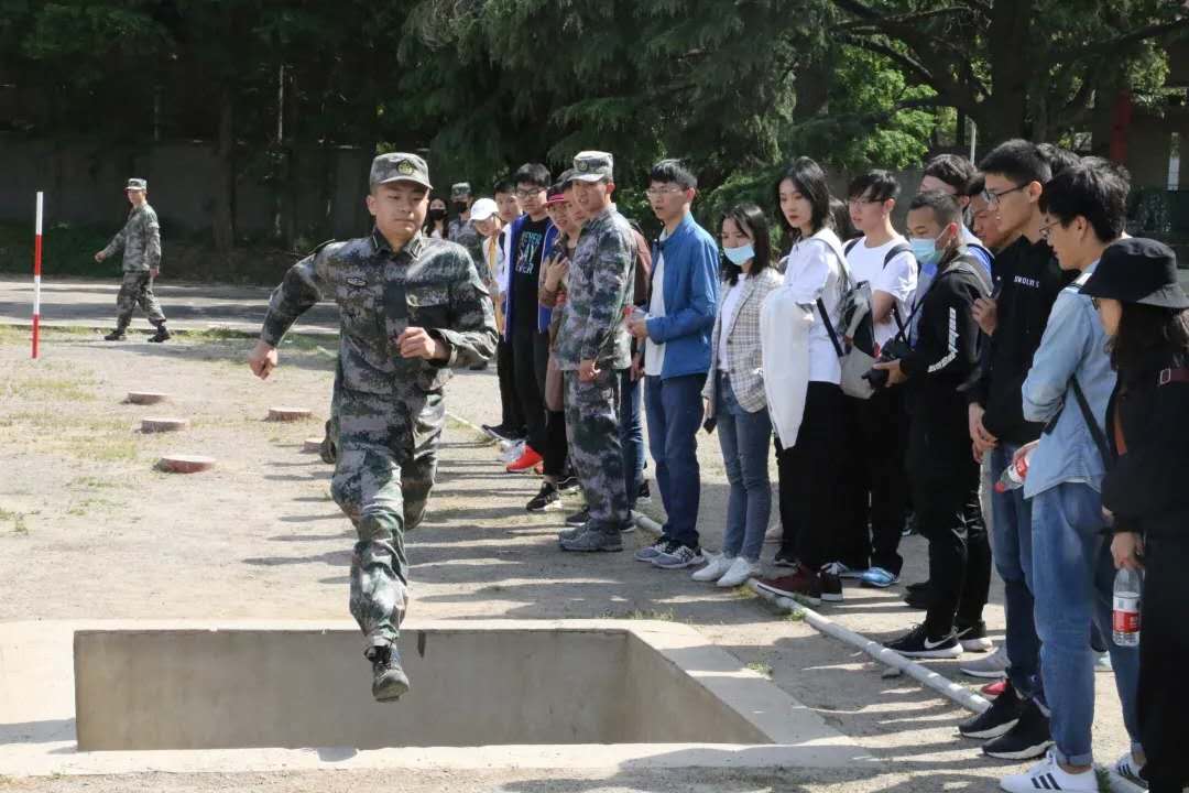 随后,陆工大通信工程学院学员十三队向来访师生进行军事技能展示,为大家介绍军事训练内容,并组织军事训练项目的体验。
