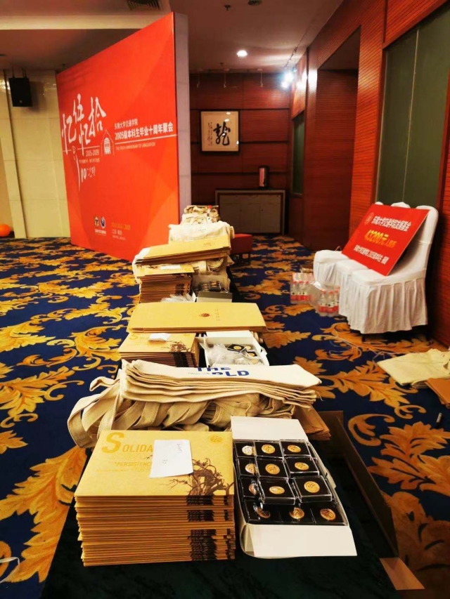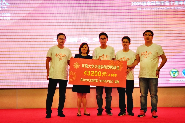 毕业十年来,05级同学在各行各业有所发展都离不开学院的培养,全体同学决定以年级的名义,向学院发展基金捐赠人民币肆万叁仟贰佰元整,聚沙成塔、集腋成裘,用点滴心意感恩母校、助力学院发展。交通3班金光来、交通5班虞熙、测绘工程郭成周以及岩土工程王守超等四位班长,代表年级向学院捐赠,并接受了学院的纪念品回赠。