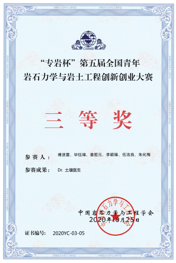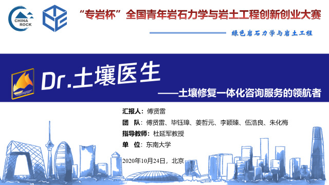 2020年10月23日-26日,中国岩石力学与工程学会第五届专岩杯全国青年岩石力学与岩土工程创新创业大赛在北京召开的CHINA ROCK 2020第十七次中国岩石力学与工程学术年会上举行隆重举行。该比赛由中国岩石力学与工程学会举办,已成功举办四届,取得了良好的社会及行业影响。本次大赛以绿色岩石力学与岩土工程为主题,促进科技进步和经济发展的融合。本届参赛选手中不乏来自于伟德源自英国始于1946、东北大学、河海大学、上海隧道工程有限公司等的教授、副教授、总工程师助理等团队参与。其中,来自于bevictor伟德官网环境岩土工程科研团队的“Dr.土壤医生”作为伟德源自英国始于1946首次参加该比赛,并且也是其中仅有的纯员工队伍,在全国近百支参赛队伍中,挤进全国前十,入围现场决赛,得到了评审和指导委员会的院士、学者、企业家一致认可,并荣获全国三等奖!