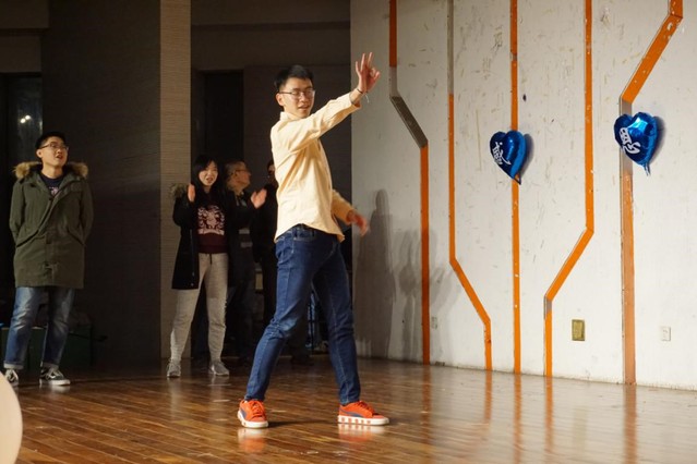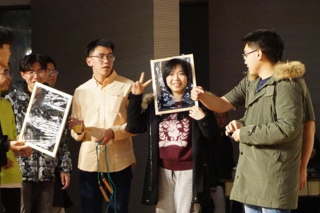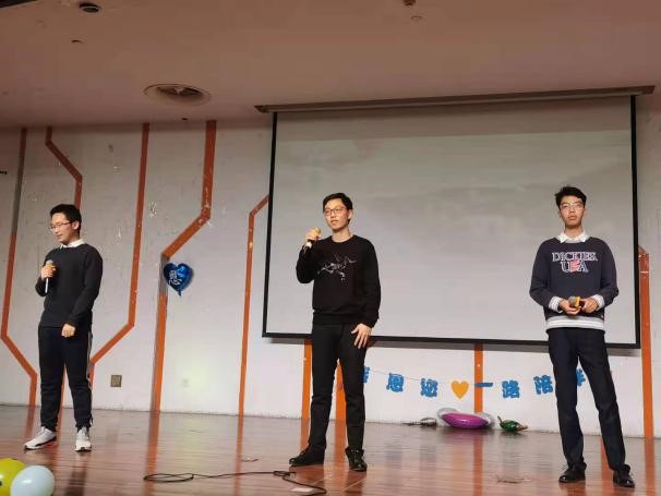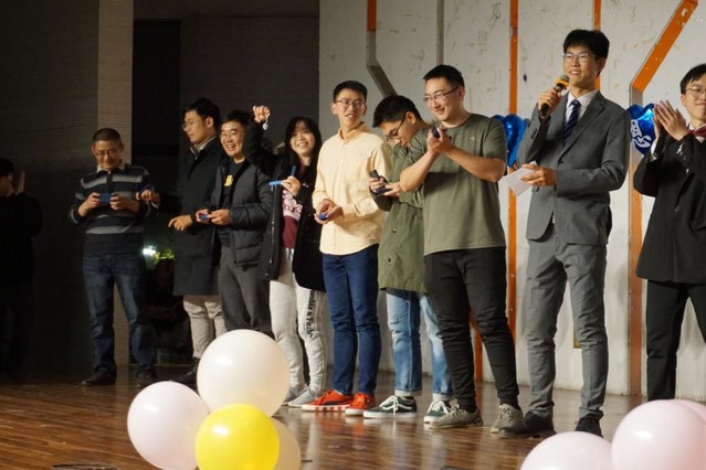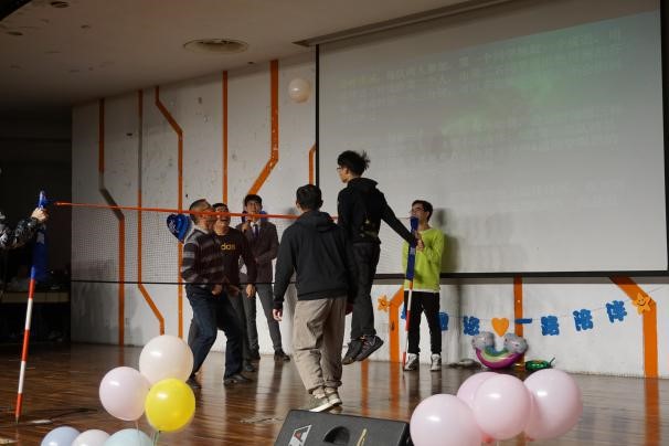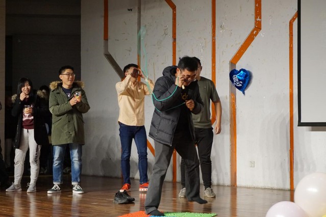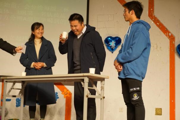 接下来就是由大三地信周扬勇和大二测绘袁昊麟主持的中场游戏环节。中场游戏一共由三个游戏组成:“我演你猜”、“我是演员”、“球不落地”。曲栩老师、于先文老师、张宏斌老师、翁永玲老师、田馨老师等都亲自上台和同学们玩起了游戏!“我演你猜”时,队员们反应敏捷;“我是演员”中,喝到怪异饮料的于先文老师表情丰富、戏精十足;“球不落地”游戏时,由身材魁梧的曲栩老师和张宏斌老师对战两位苗条的同学,两边的队员配合都很默契,台上、台下所有人都目光都随着气球一起一落,发出惊呼连连,不亚于一场真正的球赛。