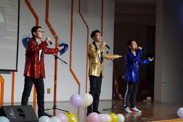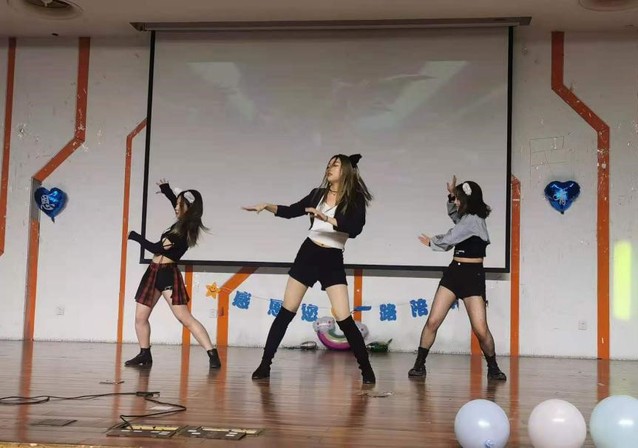 上世纪九十年代,来自宝岛台湾的偶像团体小虎队席卷了大江南北,许多歌曲至今仍然朗朗上口。而今天,来自213181班的李卓桐、张锦瑞、郭松霖三个男生组建了一只老虎队,用最经典的歌曲串烧《青春恋爱联盟》致敬他们。华丽的服装、漂亮的歌声、整齐的舞蹈,台下响起一阵阵掌声和欢呼声!