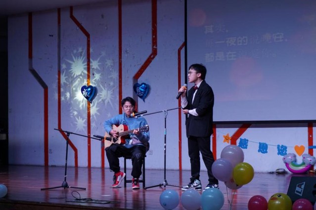 大三地信的张瑞、周扬勇带来的吉他弹唱《晚安》,不禁让人感叹:如隔三秋,是因为有人在思念;长夜漫漫,是因为有人在想念;展转反侧,是因为有人在品味孤独;孤枕难眠,是因为有人在数绵羊,爱就两个字:晚安。