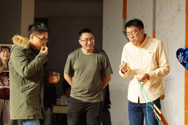 游戏结束,总分落后的一组不但收到了参与纪念奖,同时还接受了一番番奇特的惩罚:曲栩老师勇敢地走上了指压板跳绳、用脸顶破保鲜膜的田馨老师依然笑靥如花、吃着清新酸爽柠檬的李澳、刘濛濛不禁龇牙咧嘴.....,引得台上、台下哈哈大笑!