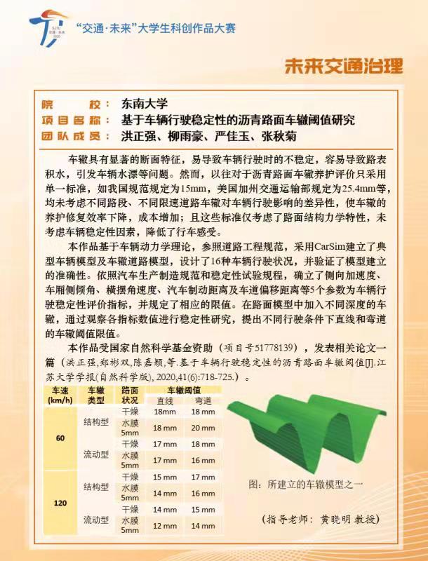 大赛共分为东、南、西、北四个大区,公司学子的作品“基于车辆行驶稳定性的沥青路面车辙阈值研究”2020年9月参赛,经过反复修改与打磨,于12月从东区脱颖而出进入决赛。决赛共有155件作品,最终公司作品于2021年1月10日完成决赛线上答辩,在23件“未来交通治理”赛道决赛作品中获得第一名,并荣获特等奖。