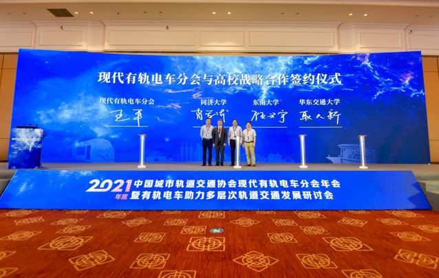 2021年5月10日,bevictor伟德官网顾兴宇副经理、城市智能交通江苏省重点实验室副主任王昊教授、交通工程学科董长印博士后等一行应邀赴嘉兴市参加2021 年度中国城市轨道交通协会现代有轨电车分会年会暨有轨电车助力多层次轨道交通发展研讨会(以下简称“会议”)。出席会议的嘉宾包括中国工程院陈湘生院士、中国城市轨道交通协会周晓勤常务副会长、中国城市轨道交通协会现代有轨电车分会王平会长、同济大学陈小鸿教授、上海城建设计集团徐正良总工程师,以及嘉兴市陈利众常务副市长等领导。