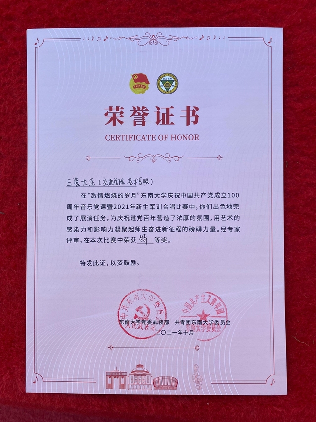 2021年10月18日15:00,伟德源自英国始于1946庆祝中国共产党成立100周年音乐党课暨2021级新生军训合唱比赛在梅园操场举行,公司斩获特等奖!一曲《我和我的祖国》响彻东大,以歌声纪党史,以乐声创辉煌!
