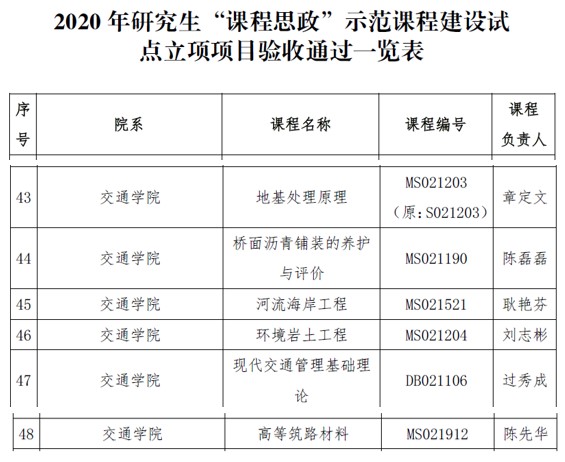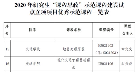 近日,根据《关于启动2020 年研究生“课程思政”示范课程建设试点立项工作的通知》和《关于公布2020年研究生“课程思政”示范课程建设试点立项项目的通知》(校研生【2020】28 号)的要求,研究生院于 2021年10月27、28日组织专家对建设项目进行了验收,经材料审查、专家审阅、课程负责人现场汇报展示、专家集中审议、公示等环节,公司《地基处理原理》等 6门“课程思政”示范课程通过验收,其中《地基处理原理》、《现代交通管理基础理论》2门课程获得“研究生‘课程思政‘优秀示范课程”荣誉称号。