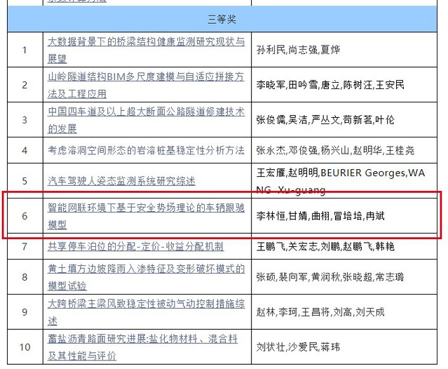 近期,《中国公路学报》第七届年度优秀论文评选中,公司黄晓明老师《沥青路面抗滑性能研究现状与展望》获第七届优秀论文二等奖,公司李林恒《智能网联环境下基于安全势场理论的车辆跟驰模型》获三等奖。