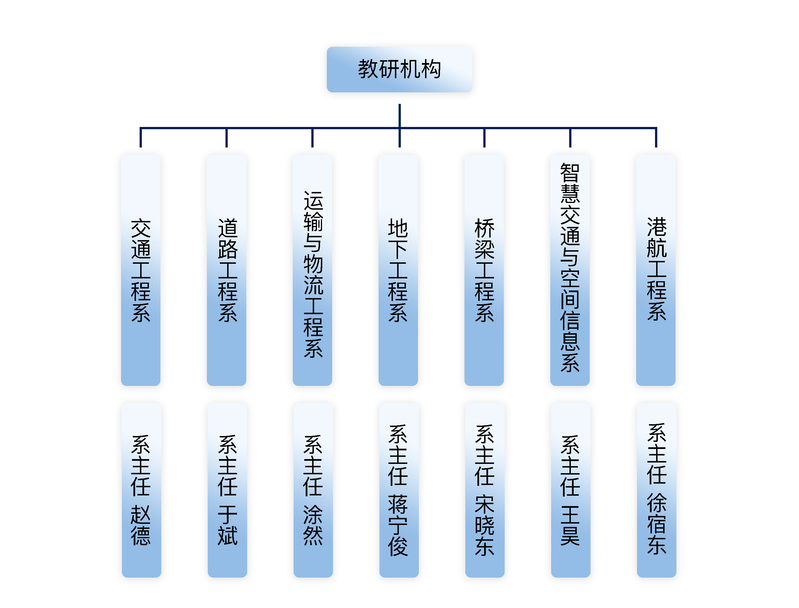 交通工程系:张文波 智慧交通系:芮一康 道路工程系:高英 岩土工程系:张林锋 机关:陈悦 交通设计院:陈小兵 | 交通运输系:涂然 港航工程系:廖鹏 桥梁工程系:朱彦洁 ITS中心:何铁军 试验中心:朱小华 |